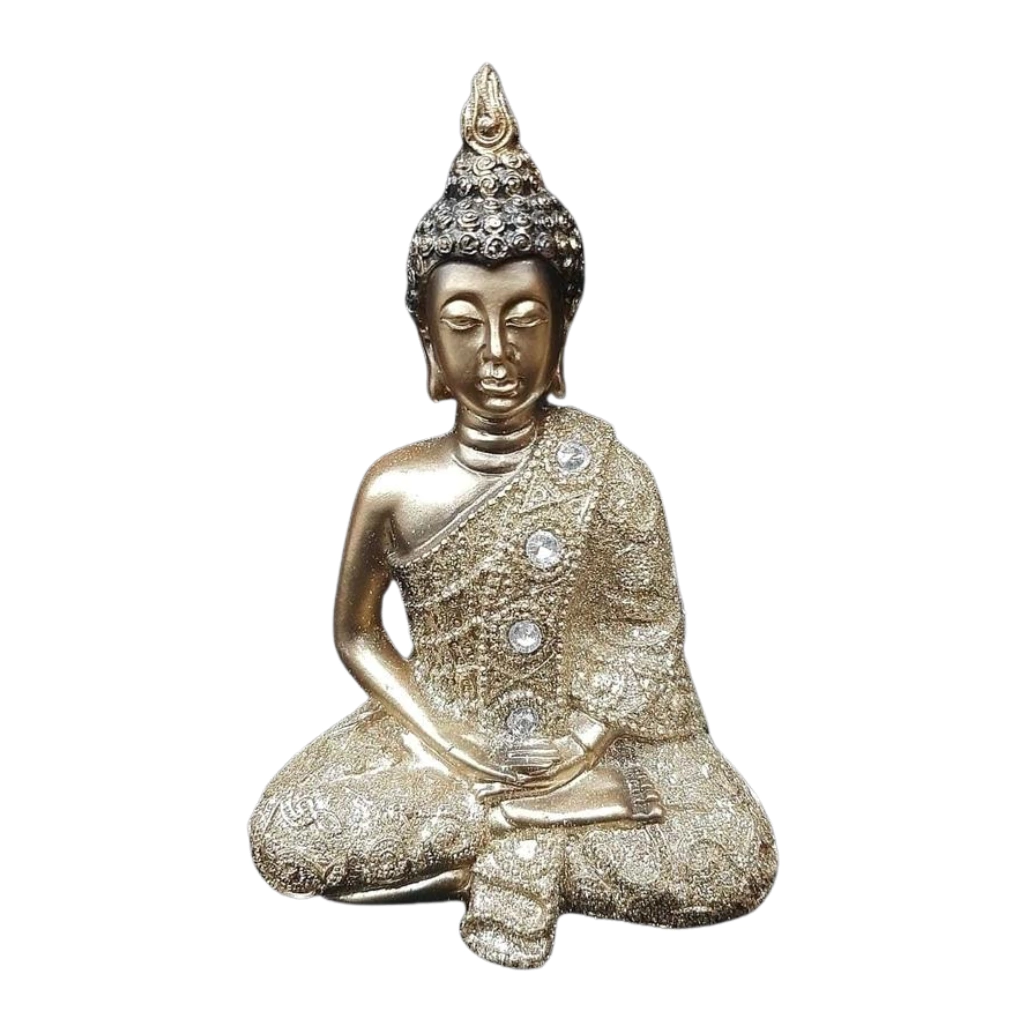 A cor dourada está ligada ao Sol, à riqueza, abundância, poder e energia. Transformando esse Buda dourado em um poderoso amuleto de prosperidade.